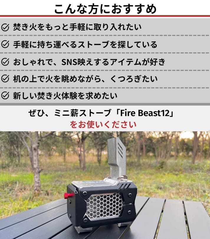 ミニ薪ストーブ「Fire Beast12」は、「荷物は最小限に、でも炎だけは本格的に楽しみたい」という声から生まれました。