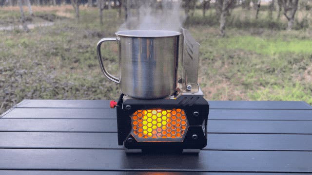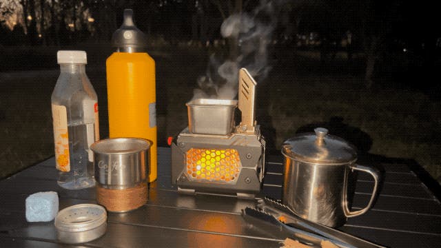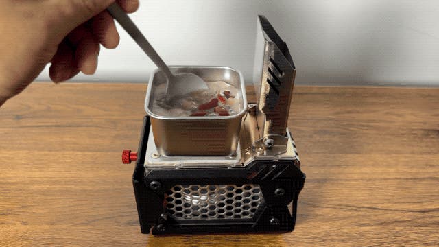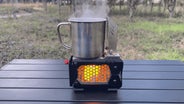 ミニ薪ストーブ「Fire Beast12」は実用性もあり、燃焼中は6.5cm×7cmの天板がしっかり熱くなり、その熱を利用してお湯を沸かしたり、簡単な調理や温めが行えます。