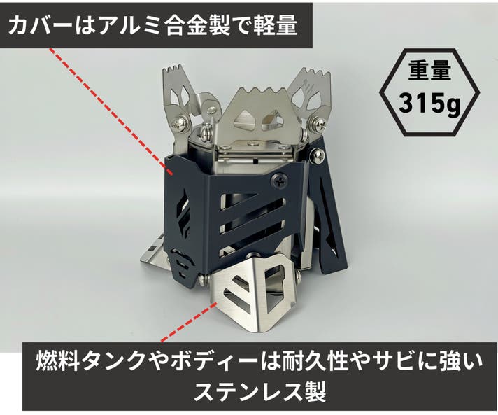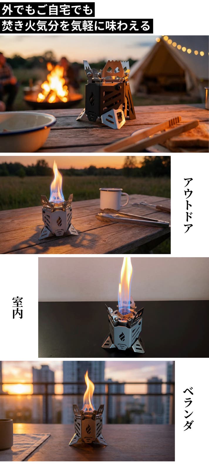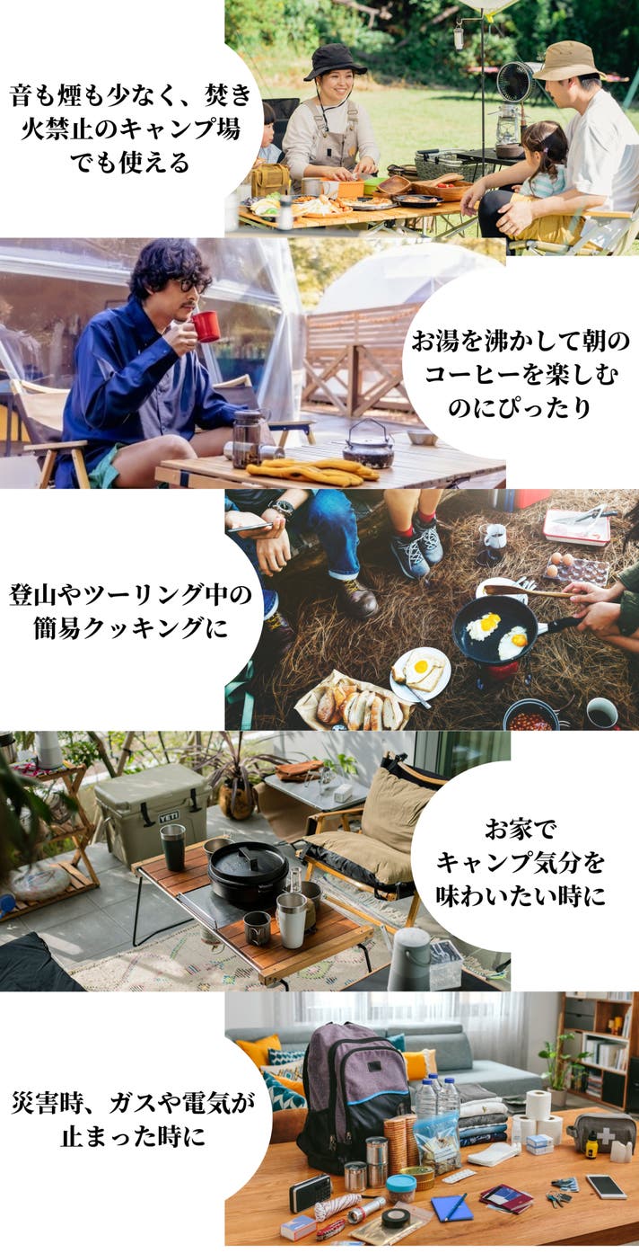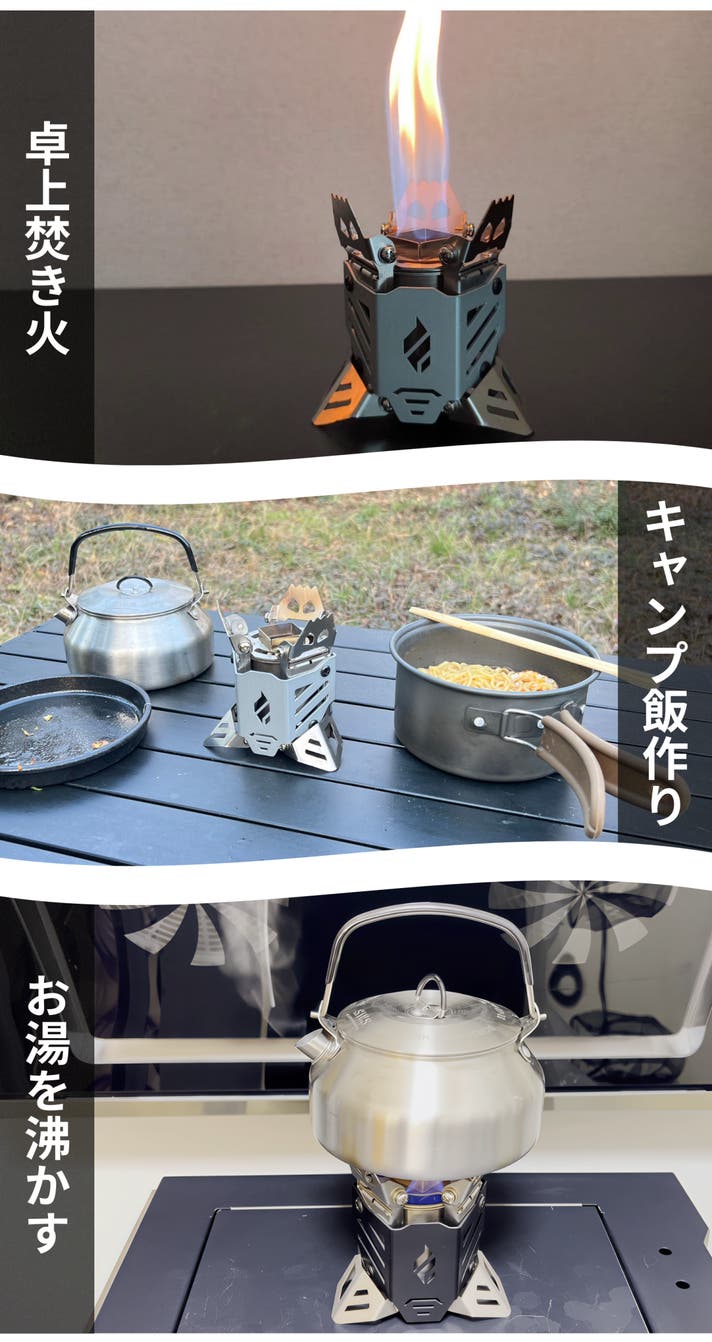 入手しやすく低燃費なアルコール燃料を使って、焚き火を手軽に楽しめるだけでなく、湯沸かしや調理までスムーズにこなせる実用性も兼ね備えています。