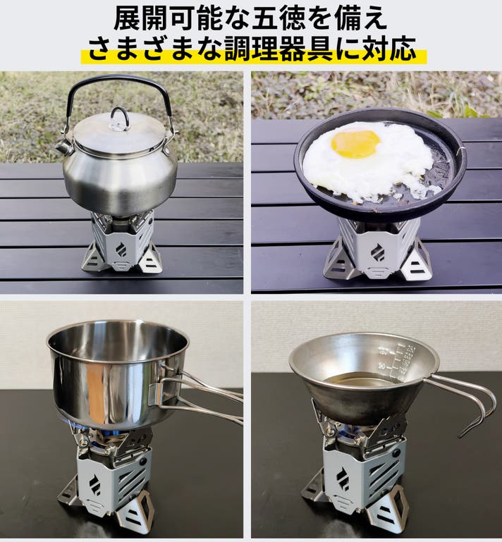 また、五徳自体が風防の役割も果たし、風の影響を抑えて効率的に調理が可能です。