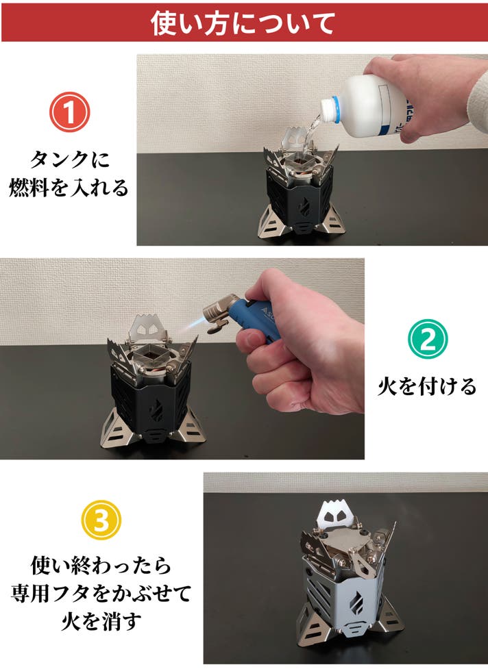A : アルコールストーブを点火する前に、周囲に燃えやすいものがないことを確認してください。アルコールをアルコールストーブの中に注ぎ、ライターまたはマッチを使用して点火します。点火した後は、アルコールストーブの周囲に十分な空間を確保してください。