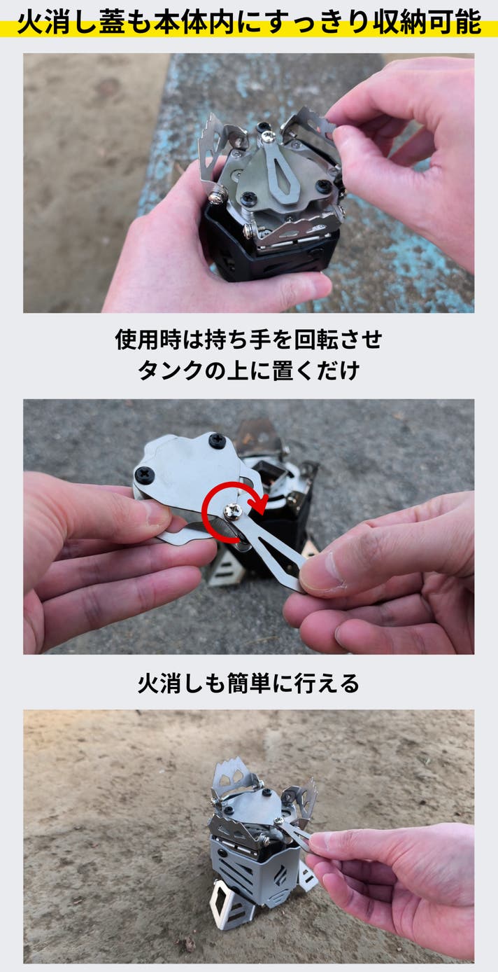 火消し蓋をタンクの上にかぶせたまま五徳を閉じれば、そのままスッキリ収納できるのも嬉しいポイント。