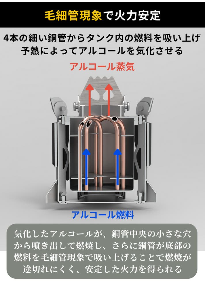 毛細管現象によりアルコールを吸い上げ、熱してから気化まで早く、また燃料の量には左右されません。