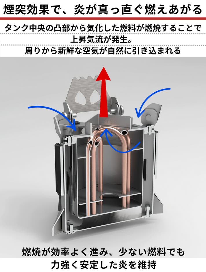 空気の流れを整え、燃焼を勢いよく安定させる「煙突効果」と、燃料供給を支える「毛細管現象」。この2つを掛け合わせることで、点火からスムーズに本燃焼へ移行し、力強い炎を継続できる構造が見えてきました。