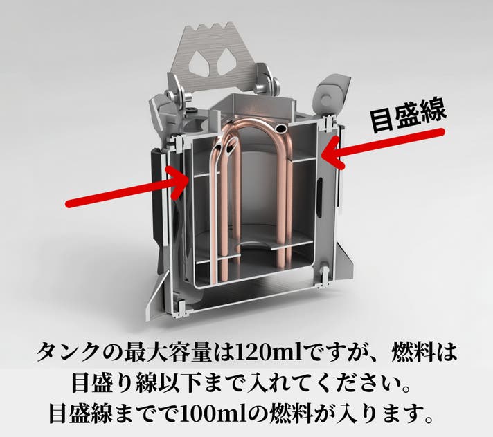 タンク内には燃料目盛線としての金属リング付きで、多量にアルコールを注ぐ心配がありません。