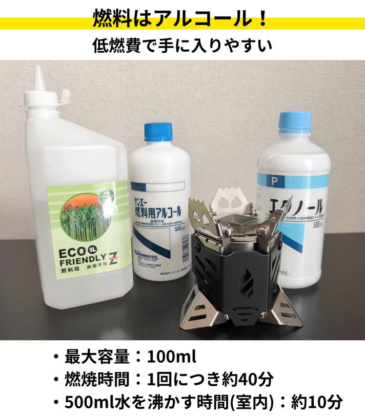 アルコールストーブ「Fire Beast 13」は、比較的手に取りやすい価格帯のアルコール燃料を使用します。扱いやすく、コストパフォーマンスの面でもおすすめです。