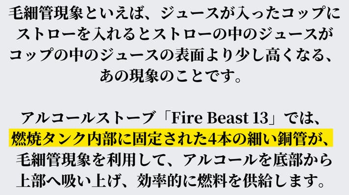 アルコールストーブ「Fire Beast 13」は高火力を追求し、独自の構造により、毛細管現象と煙突効果を利用することで、力強く安定した炎が立ち上がります。