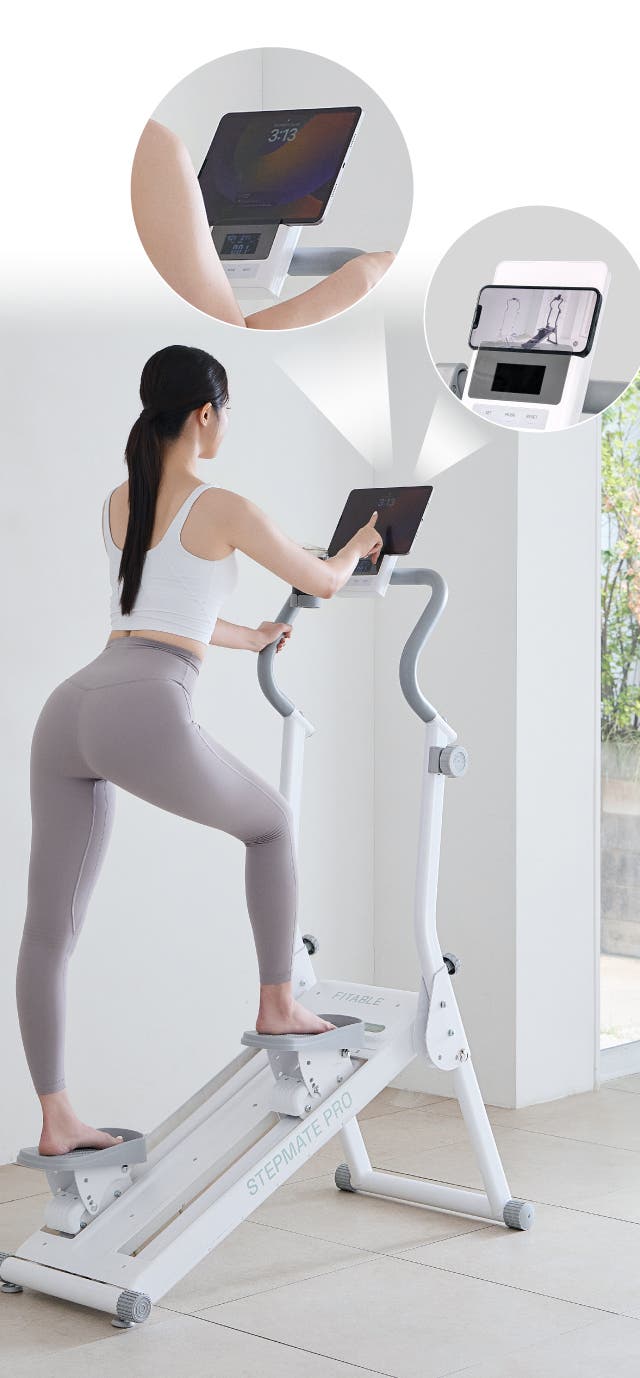 無限階段 PROは、トレーニング中もユーザーへの細やかな気配りを大切にしています。7 IN 1スマートタイマーで運動データをひと目で確認でき、ボトルホルダーやタブレットスタンドを活用して水分補給をしながら、お気に入りのコンテンツを楽しみつつ、快適にトレーニングに集中できます。