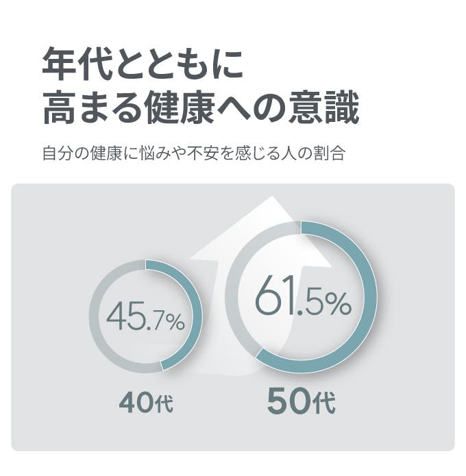 50代以降、健康への不安が一気に高まります。 内閣府の調査によると、「自身の健康に悩みや不安を感じている」と答えた人の割合は, 40代では45.7%だったのに対し、50代では61.3%まで上昇しています 。 これは、加齢によって筋力や持久力の低下を実感し始めるタイミングと重なります。