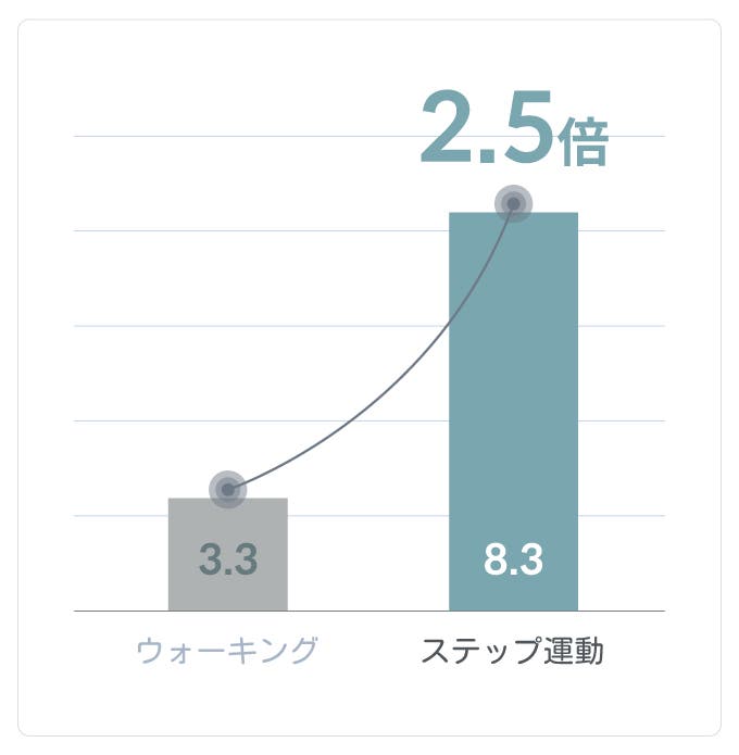 ステップ運動は、ウォーキングの約2.5倍の運動効果。国際的な運動強度の指標「MET(代謝当量)」で比較すると、ウォーキング(3.3MET)に対し、ステップ運動は8.3METを記録しています。しっかりとした運動強度が得られ、同じ時間でもより多くのカロリー消費が期待できます。短時間で効率よくトレーニングしたい方に適した運動法といえるでしょう。