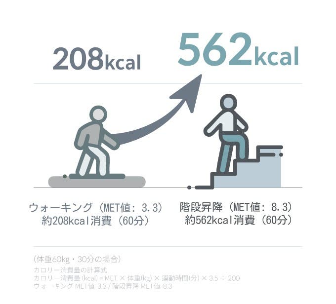 なかでも、階段昇降運動はウォーキングの約2.5倍のエネルギーを消費するとされており、