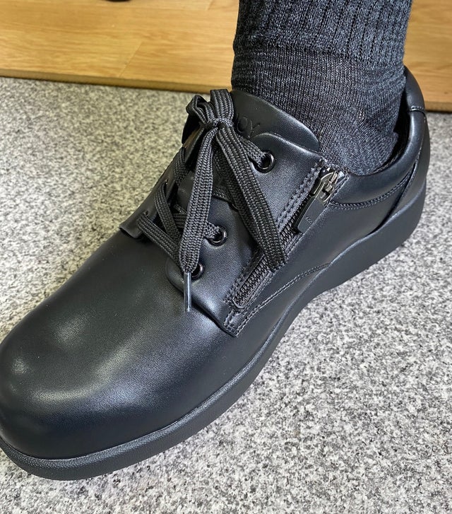通常F規格では、かなり幅が広がり見た目も違和感がありますが、FITJOY MEDICALでは高さを取ることで足囲に余裕を持たせているので、デザインもスッキリとしています。また3枚のインソールが標準装備されているので、自分の足長にあったサイズを選びフィットさせることが簡単にできます。