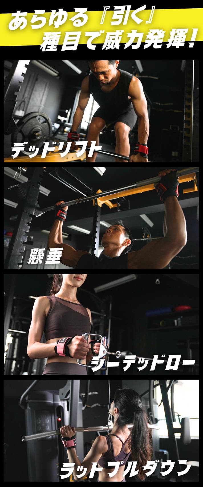 A. デッドリフト、懸垂、ラットプルダウン、ローイング系など、「引く動作」全般に使用できます。フリーウェイトはもちろん、マシンでも活用可能です。