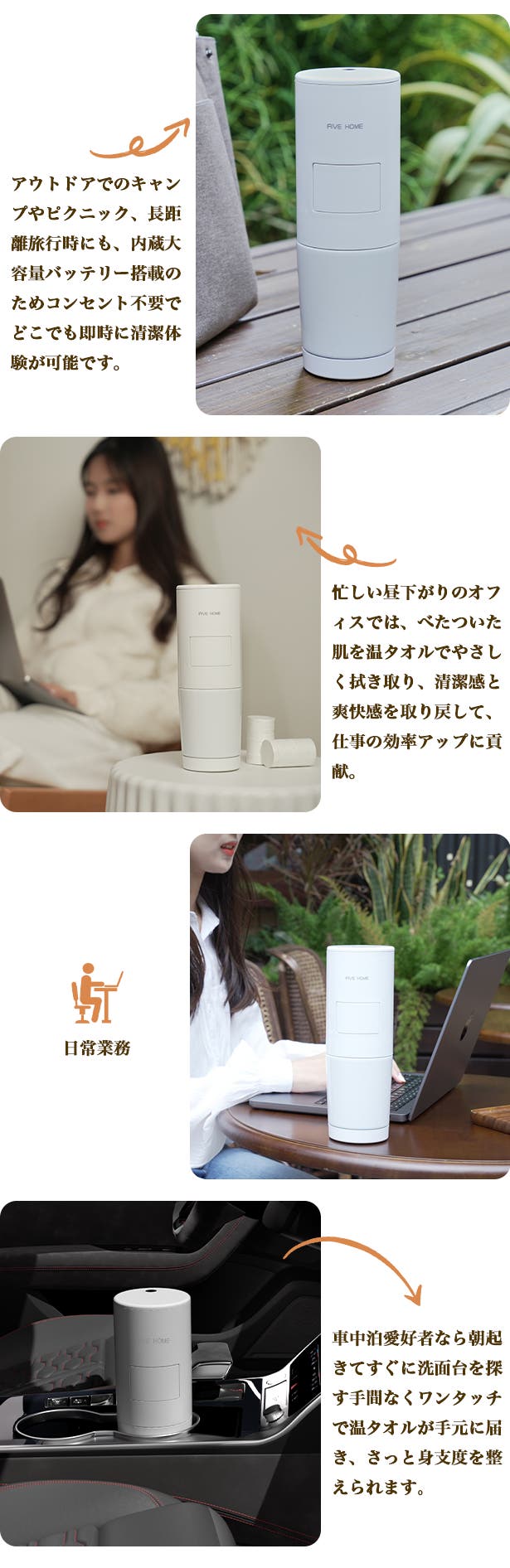 車の休憩中やアウトドアでの急な清掃ニーズにも瞬時に対応。コンセント不要な大容量バッテリーを内蔵しているため、いつでもどこでも、ワンタッチで温かいタオルをご利用いただけます。旅先や外出先でも、指先ひとつでこれまでにない快適さと温もりを体験してください。