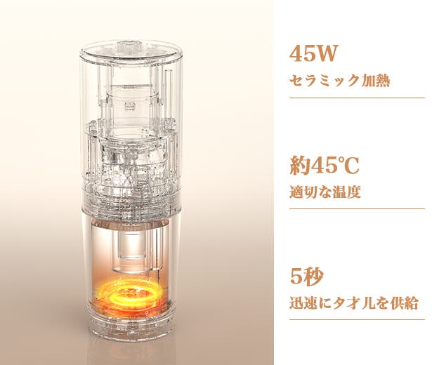 ※タオルの加熱には別途電源が必要です。最大加熱出力は45Wで、180mlの水を15℃から45℃まで加熱することができます。