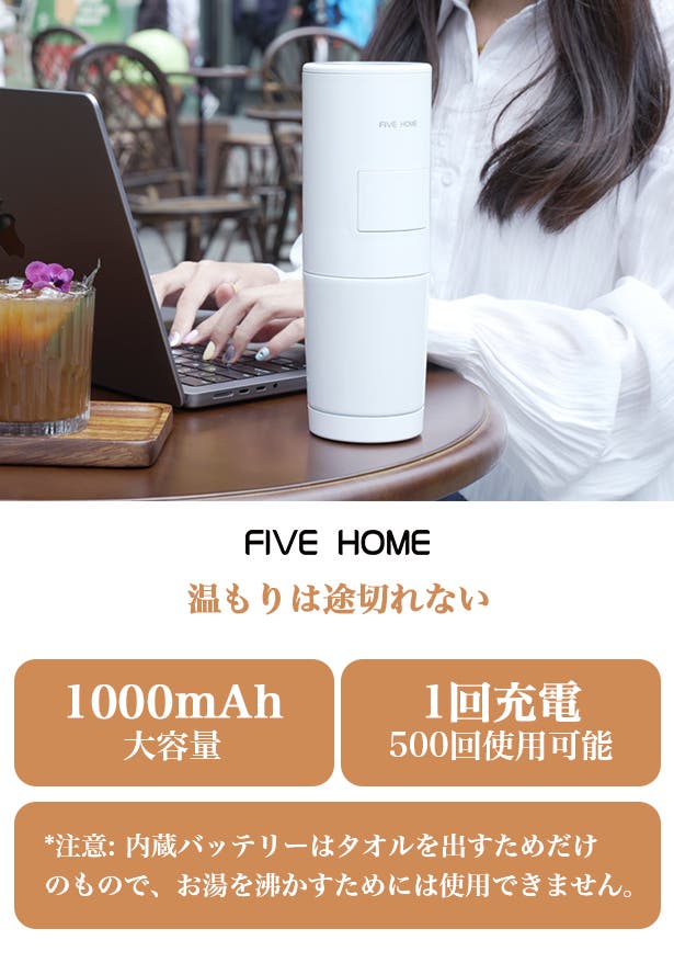 A2:FIVE HOMEの内蔵バッテリーはタオルの取り出し専用であり、水カップの加熱機能は備えていません。水カップを加熱するには、別途電源が必要です。