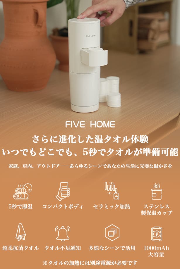携帯型タオル機「FIVE HOME」は、そんなかけがえのない瞬間を、たった5秒でお届けします。