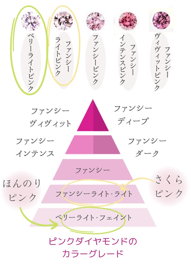 【ほんのりピンク】は、ほぼ無色透明に近いダイヤの輝きで、さりげないピンク味が特徴です。【さくらピンク】は優しくて可愛らしいファンシーライトピンクの色味です。