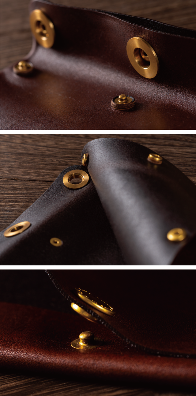 - 1枚の豪華なホーウィンレザーを、6つの頑丈な真鍮のスナップと手縫いによってひとつずつ制作。