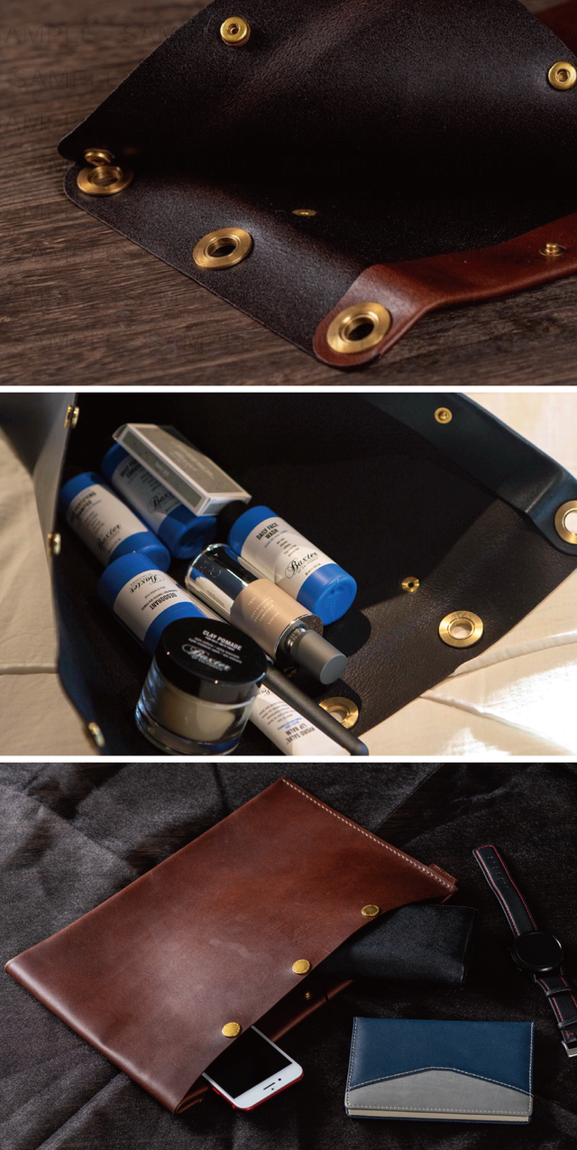 【Flat Folio Dopp Kit】は、1枚の豪華なホーウィンレザーを、6つの頑丈な真鍮のスナップと手縫いによって成型しています。バッグは2つの面を完全に開くことができるので、中身を簡単に取り出せます。