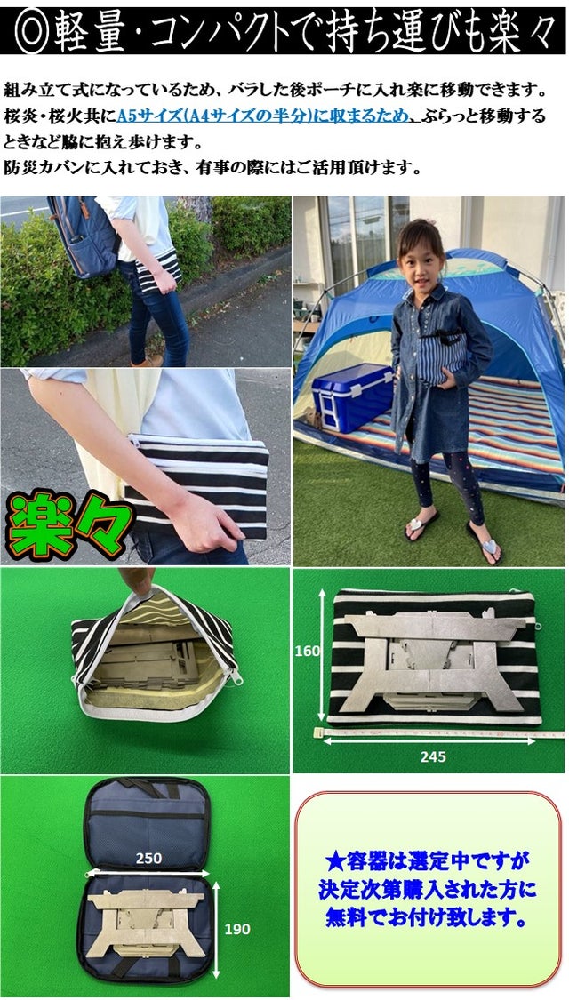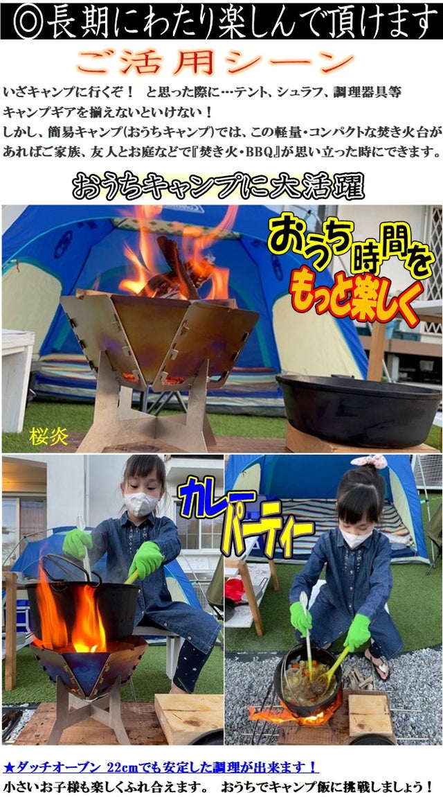- 持ち運びが容易な軽量・コンパクトな焚火台はどんなシーンでも大活躍!