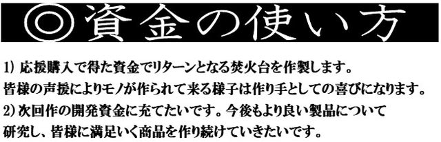 私たちはプロジェクトを実施するにあたり利便性・耐久性という観点で 現在、試作品のモニタリングや評価を重ねております。 その中で不具合等が出た場合には、改良等も行うつもりです。 購入頂いてリターンを発送する際には形状等外観が若干異なる場合がございます。 お客様に快適に使用頂くための改良ですので何卒ご容赦頂きたくよろしくお願いいたします。 商品の特性上焚火中は非常に製品が熱くなっております。 焚火開始~焚火終了(火が消えてもしばらくは熱いです)取り扱いについては火傷などに 十分お気を付けてご使用ください。 デザイン上先端が尖っている箇所もございますので、手を傷つけないよう 皮手袋をしてご使用ください。当商品を利用しての事故・ケガ等については 責任を負いかねますので十分ご注意ください。 使い始めは組み立てが固いですが、使用するにつれて組み立てやすくなります。 本文中に記載させていただいたスケジュールは、あくまでプロジェクト公開時点の予定です。応援購入の性質上、配送遅延のおそれがございます。 原則として、配送遅延に伴う応援購入のキャンセルはできませんが、リターン配送予定月から2ヵ月を超えた場合には、希望者に限りキャンセルにて対応させていただきます。