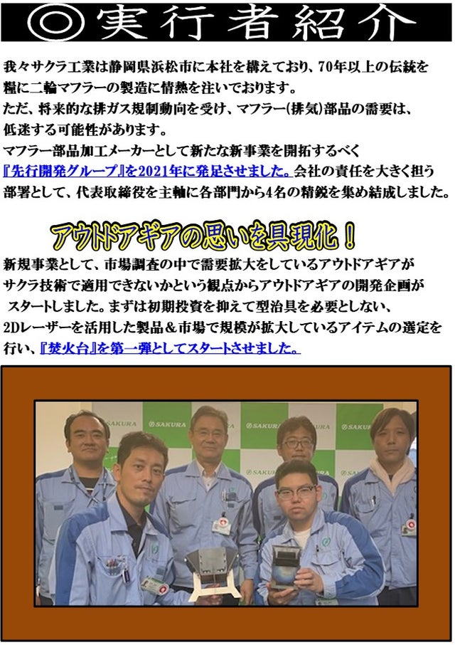 - 新事業への挑戦!2輪・4輪マフラー部品メーカーの技術を活用した開発型アウトドア新商品‼