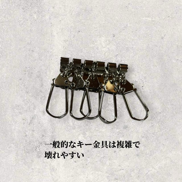 従来のキーケースはキーケース用の金具が使われます。しかしこれは鍵用に作られた金具でキーレスをつけるための金具では無いので、全長が長くなってしまい下からはみ出すことも多くなってしまいます。