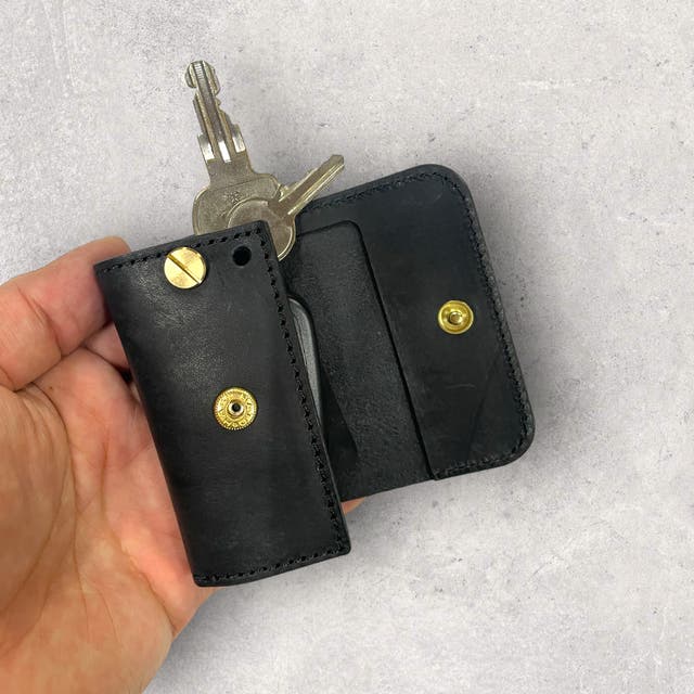 【fleurs】長い組みネジで2枚の革を固定し蓋を開けても半分しか開かない構造にすることで、従来のキーケースのように大きく開ける手間をなくし、蓋を開けるだけで、簡単にキーレスや鍵を出すことを可能にしました。