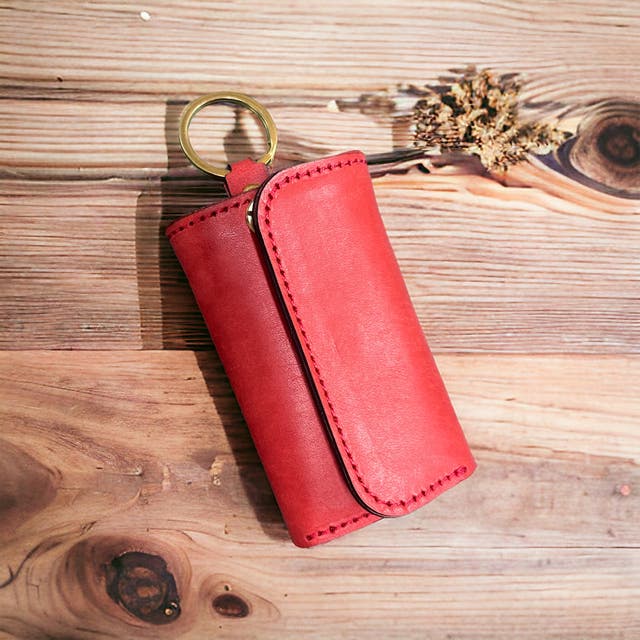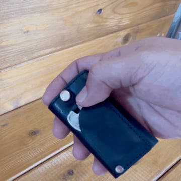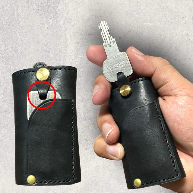 よく使う鍵は、外側のポケットに収納!鍵に通す革の形を試行錯誤して最適な形状を発見しました。下画像の赤丸部分を横に押すことで簡単に出すことが可能です。