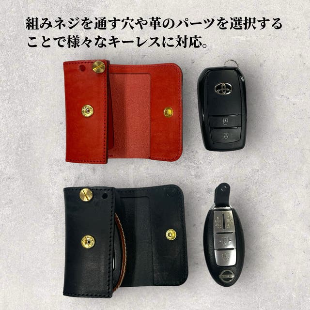 キーレスは引っ掛ける部分の形状や種類が沢山あり、それに対応するための工夫が必要でした。【fleurs】は組みネジを通す穴やキーレスに革のパーツを付けるつけないを選択することで、様々なキーレスに対応しております。