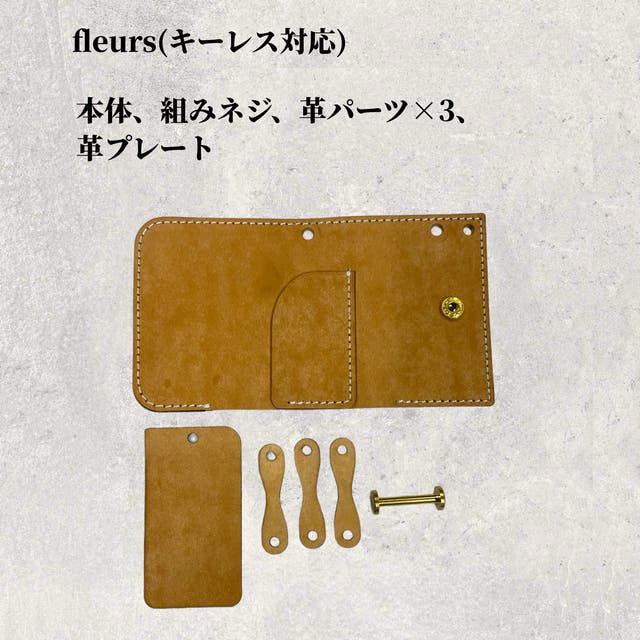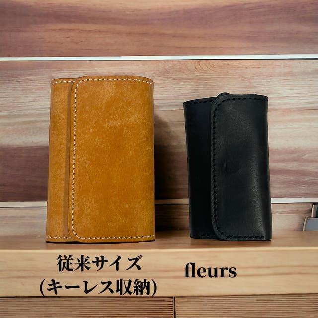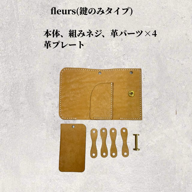 キーレスを使わない方用に鍵専用のfleursもご用意しました。鍵専用は革パーツが4個付き、鍵の種類にもよりますが1〜5本を収納することが可能です。8.3cm×5cm×3.5cm(収納する鍵によって若干変わります)(購入時の質問欄にて選択ください)