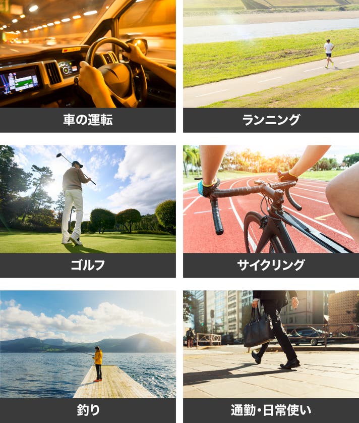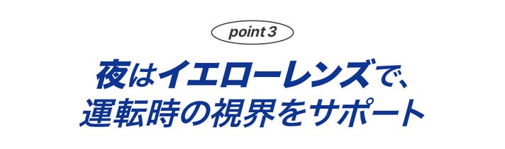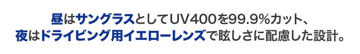 - 昼はサングラス、夜はイエローレンズで眩しさを抑え、運転時の視界をサポート