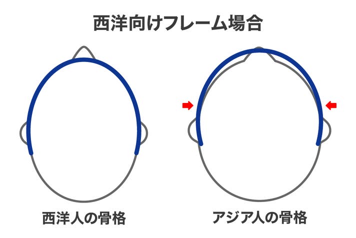 そのため、西洋向けフレームを使用すると、顔幅とのバランスが合いにくく、締め付け感やズレを感じるケースもあります。