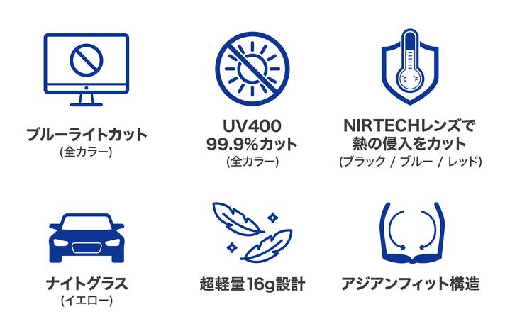 - 超軽量TR90NZZ素材と金型設計のアジアンフィット構造で長時間も快適な装着感!