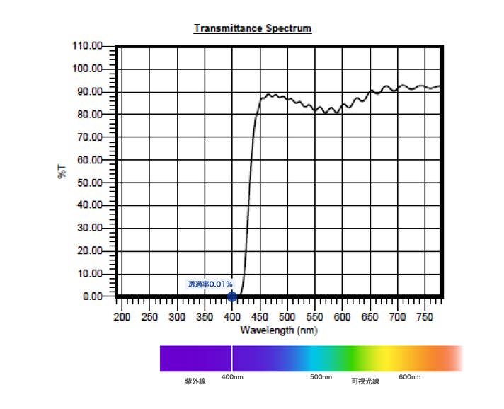 また、試験リポートに基づき、紫外線領域において透過率0.01%を確認し、