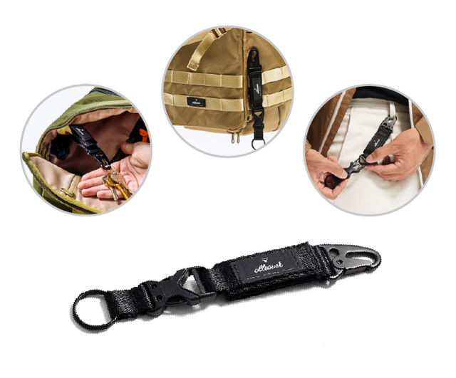 サイドリリースバックル、キーリング、フックホルダーが一つになったナイロンウェビング素材の超多機能フックマスターキーリング。