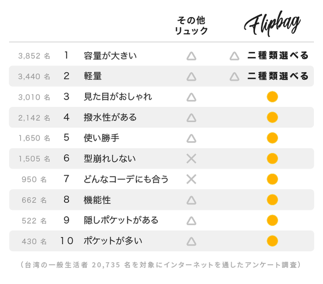 Flipbag(フリップバッグ)は一つのファスナーだけで形と色が変わるマルチリュックです。職人の30年に及ぶ製品開発と多くのユーザーのトライアル、さらに3年間の改良や企業努力を行うことによって生まれました!最も優れた特徴は、今までにない手軽さでオン・オフ切替えができ、多様なシーンに合わせられることです。