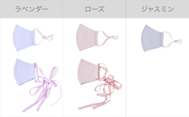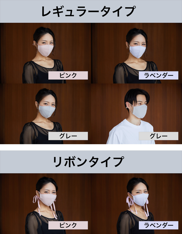 - リボンマスクとレギュラーマスクの2種類をご用意。男女ともに使用できる3種類のカラー展開。