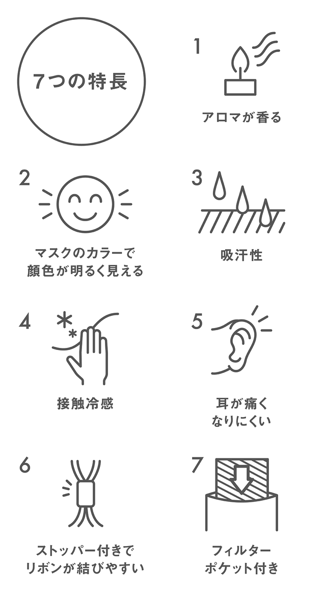 - 着用すると3種類のアロマがふんわり香り、気分を上げる布製マスク。