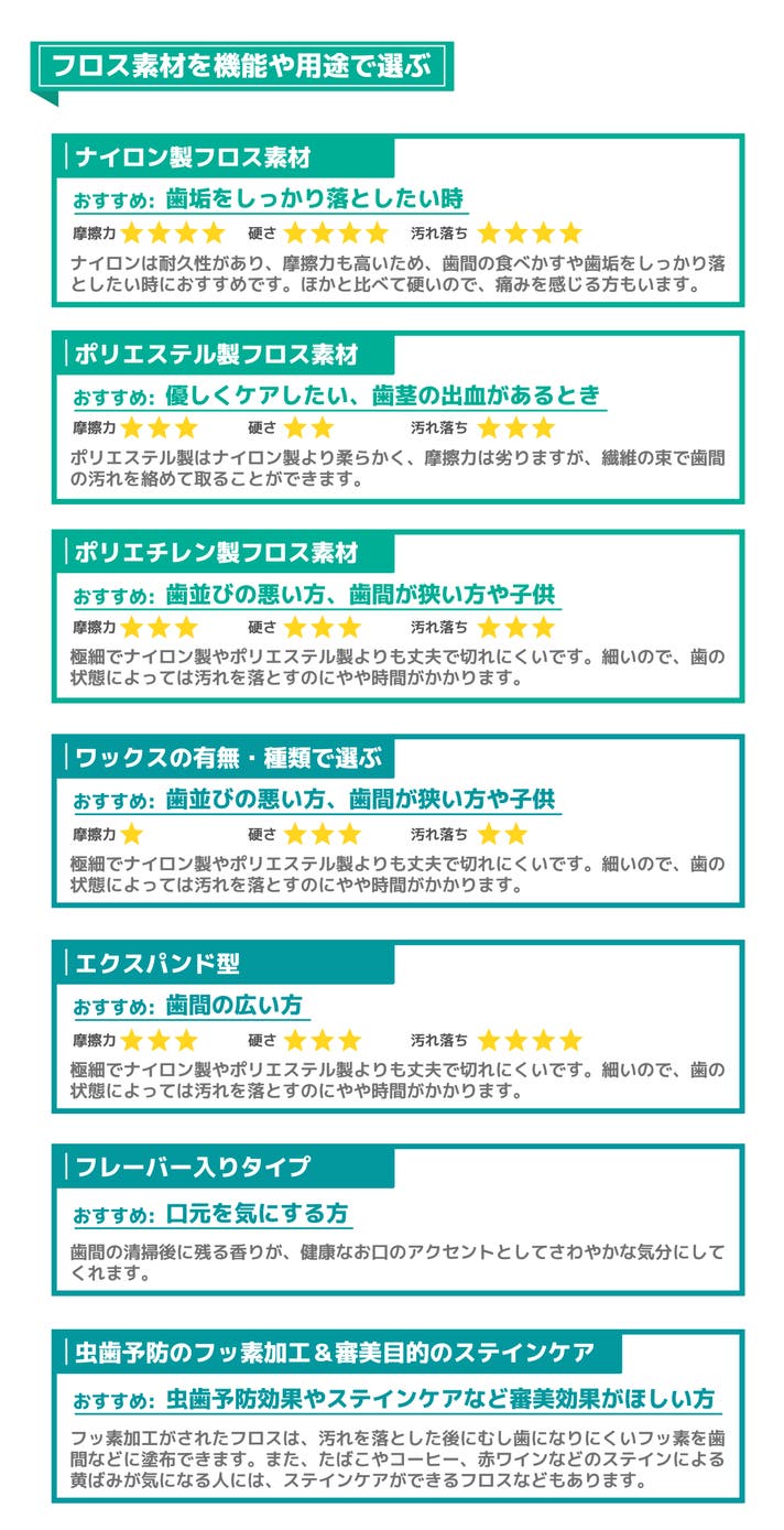 A:基本的にほぼ全てのフロス素材と互換性があり、利用可能です。あなたの歯の状態に合わせて最適なフロス素材をお選び頂けます。