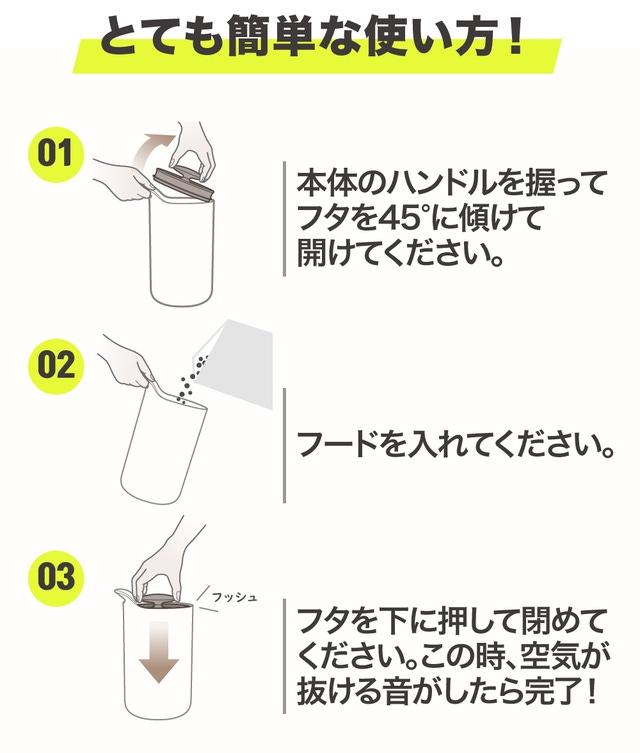 フタを開けてフタを押すだけで自動的に密閉されます。