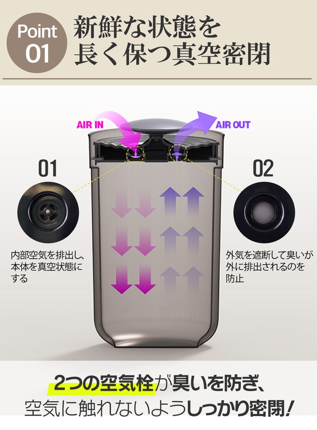 最初の栓が本体内部の空気を排出し、2番目の栓が外部の空気が中に入らないように遮断し、フタを包むゴムパッキンがもう一度完全に密閉されます。