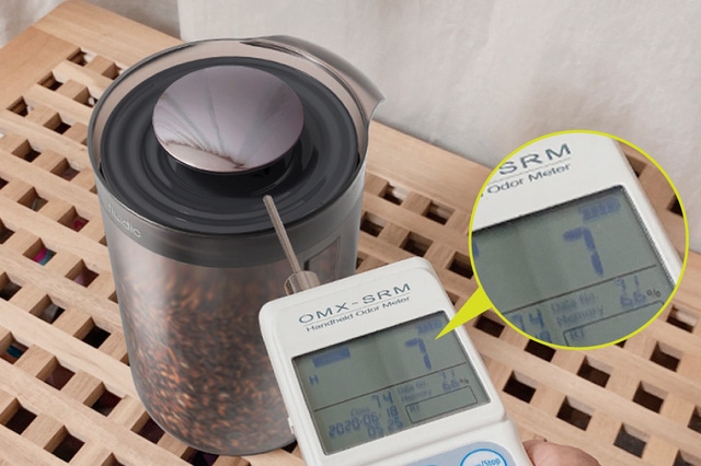 フルディックフード密閉容器にコーヒー豆を入れた後、OMX-SRM匂い測定器で測定すると約7強度の数値が確認されました。この数値は一般家庭の平均室内の臭い(7~8強度)と同じなので、フルディックフード密閉容器内の臭いが外に漏れにくいことが確認できます。