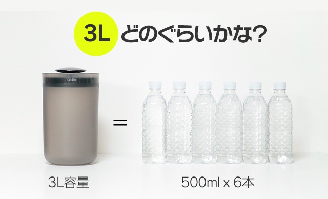 3Lの容量は500mlミネラルウォーター6本が入るサイズです。