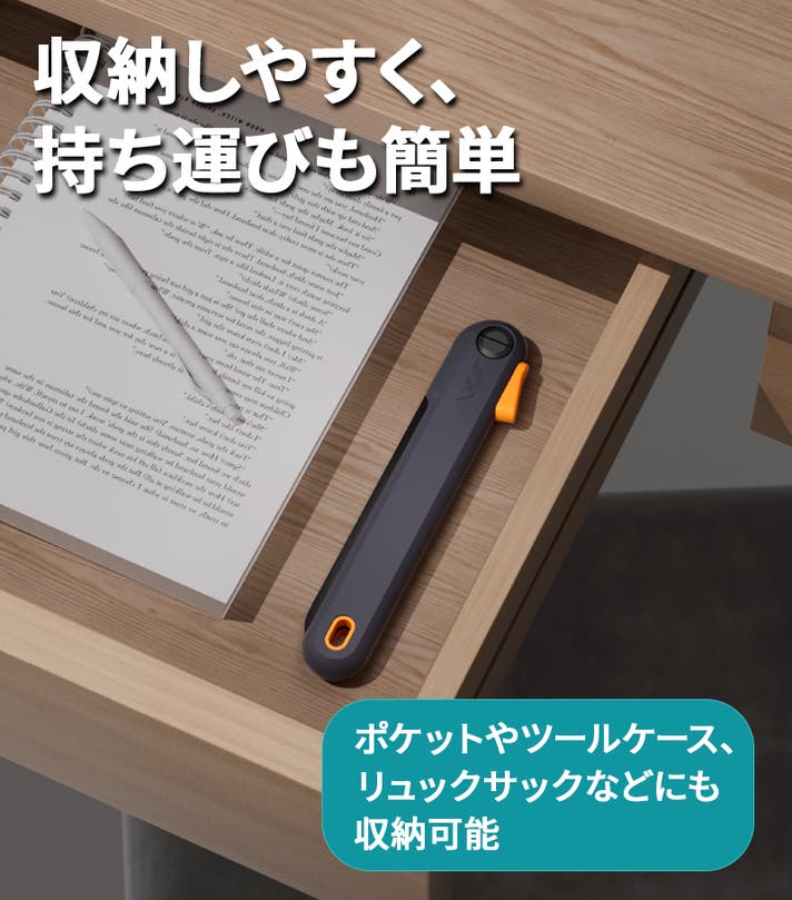 A3: 刃は折りたたみ可能で、保護ロック機構があり、使用や収納時に意図せず開くのを防ぎます。また先端部分は丸みを帯びた設計で、怪我のリスクを低減しています。