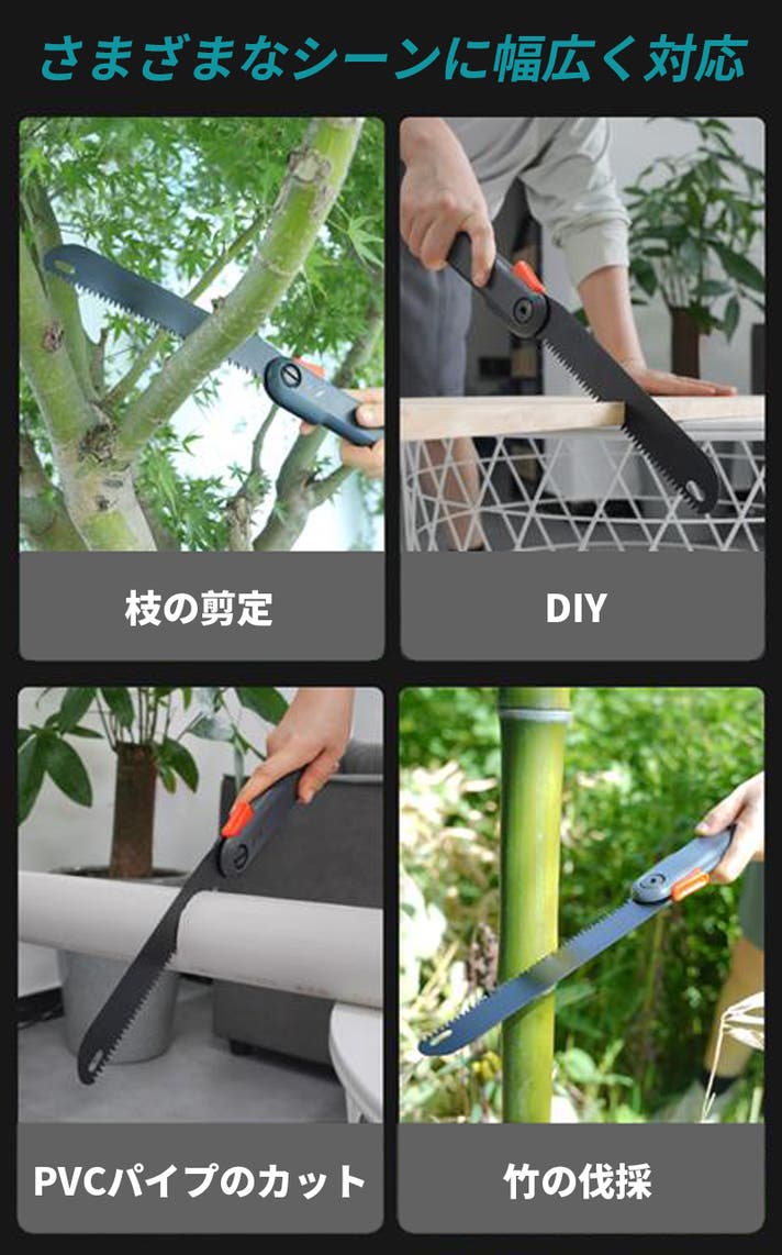 A1: 木材の切断、枝の剪定、キャンプでの薪切り、庭仕事など、屋外・ガーデン・DIY作業全般に使える万能ハンドソーです。軽量・折りたたみ式で持ち運びも簡単です。