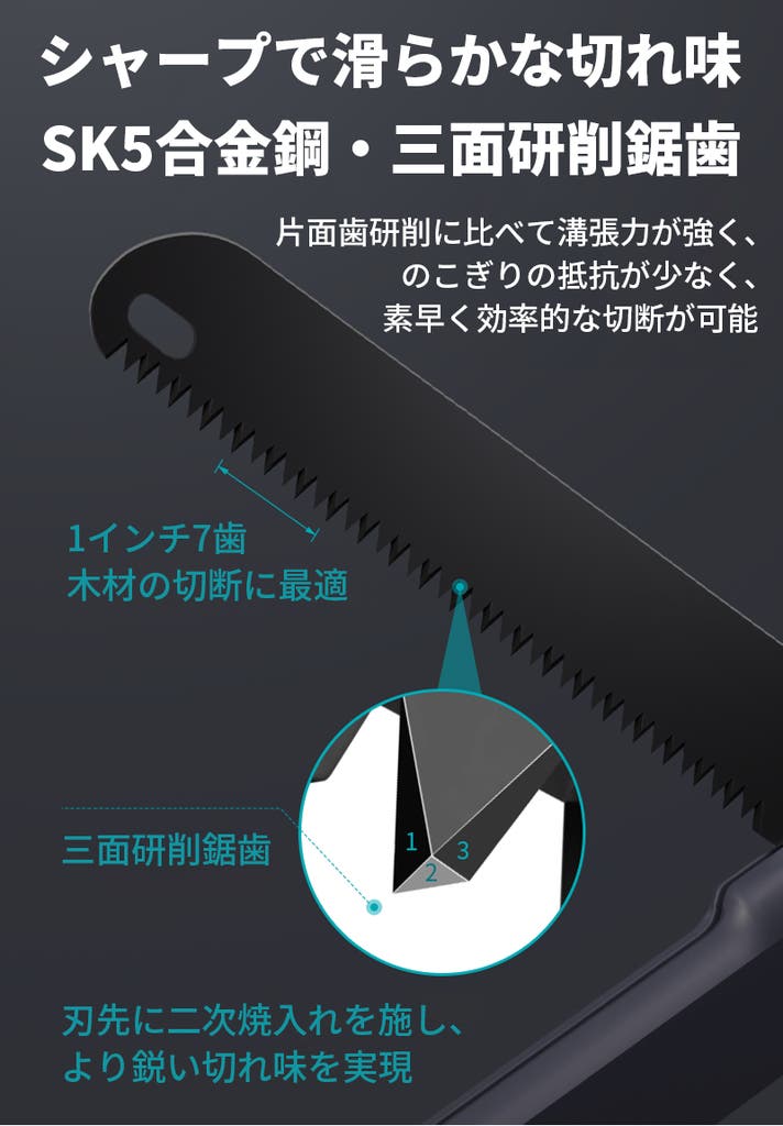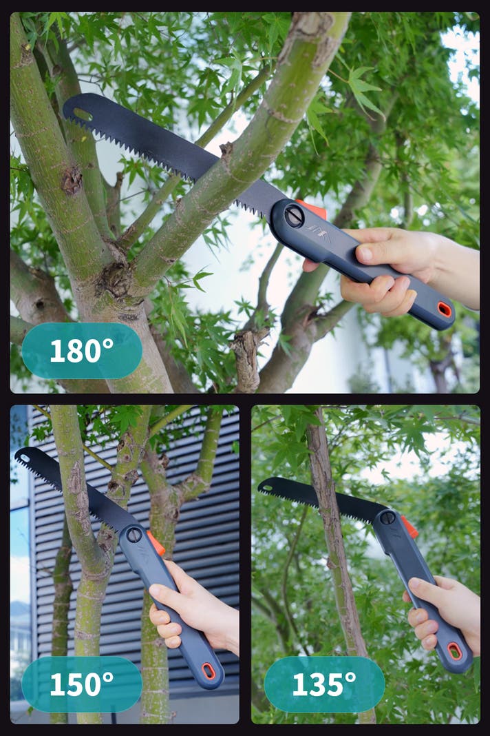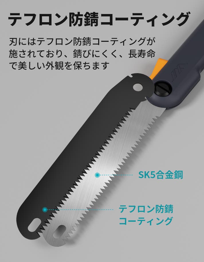 A2: ハンドルは耐久性のあるABS樹脂、刃はSK5合金鋼を使用し、三面研磨された歯で太い枝もしっかり切れます。刃にはテフロンコーティングが施され、錆びにくく長持ちします。