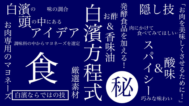 簡単に言うとこの商品は、「お肉専用のマヨネーズ」ではありますが、奥に隠された味の調合は白濱ならではの技となります。