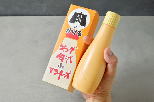 加工食品として記録的大ヒット(約180万個販売/2017年9月現在)を記録している「ご飯にかけるギョーザ」の発案者で製作を担当した白濱一久が次なる風変わりなギョーザをアイデアのベースとした商品を作り上げました。ギョーザをご飯にかける発想の次は、ギョーザの肉汁を活かしたマヨネーズを作り上げ、お肉にかけて食べると言うこれまたパンチの効いたアイデア商品を発表させていただきます。